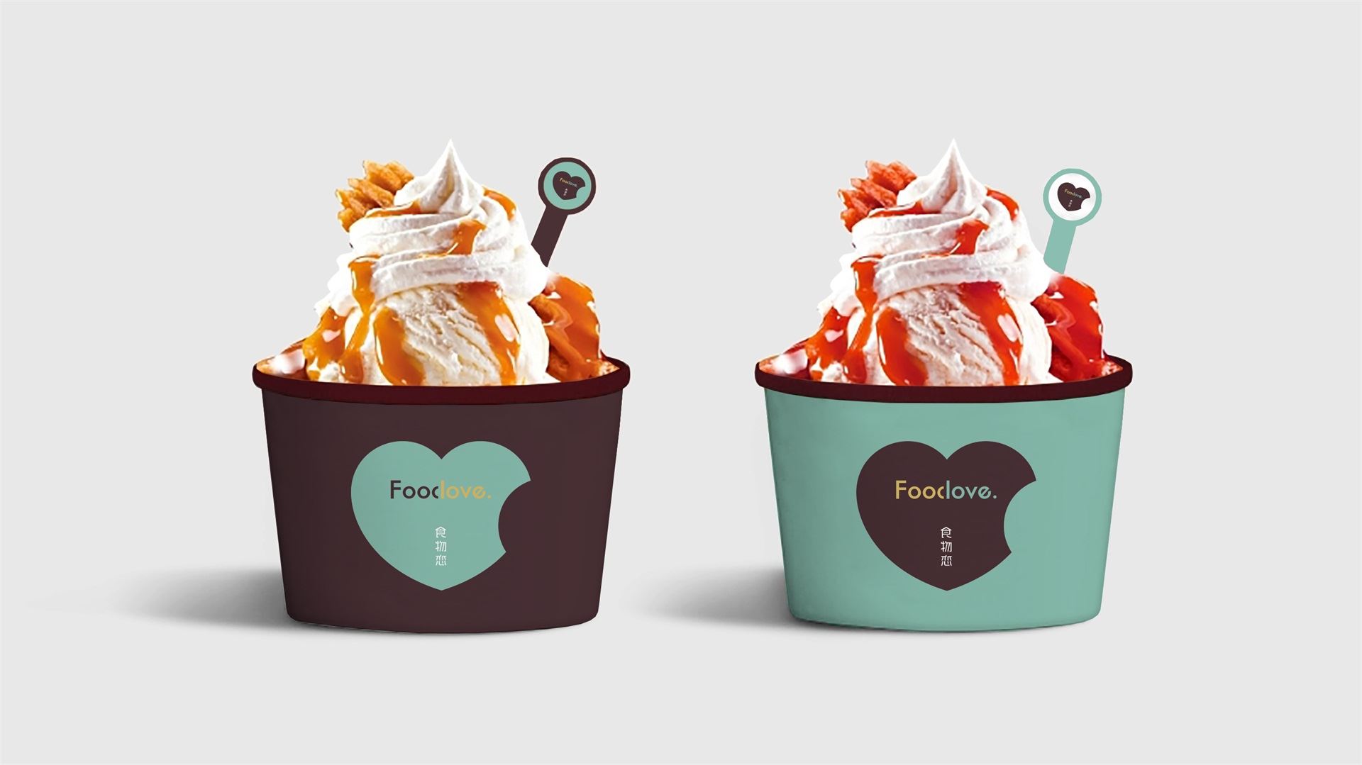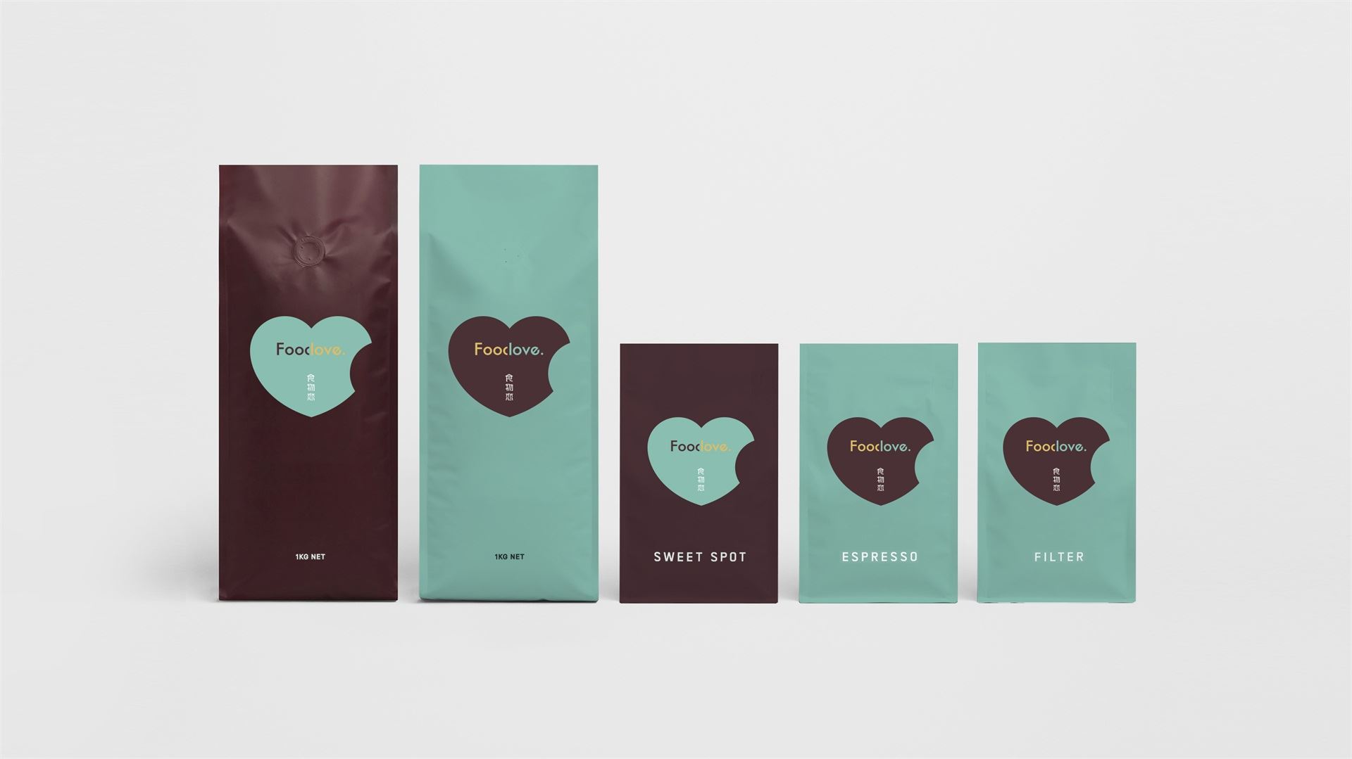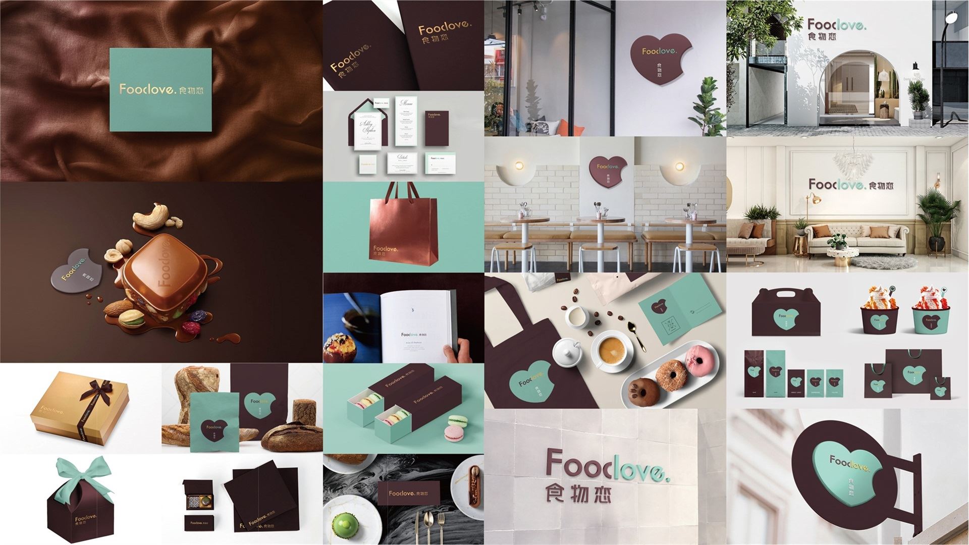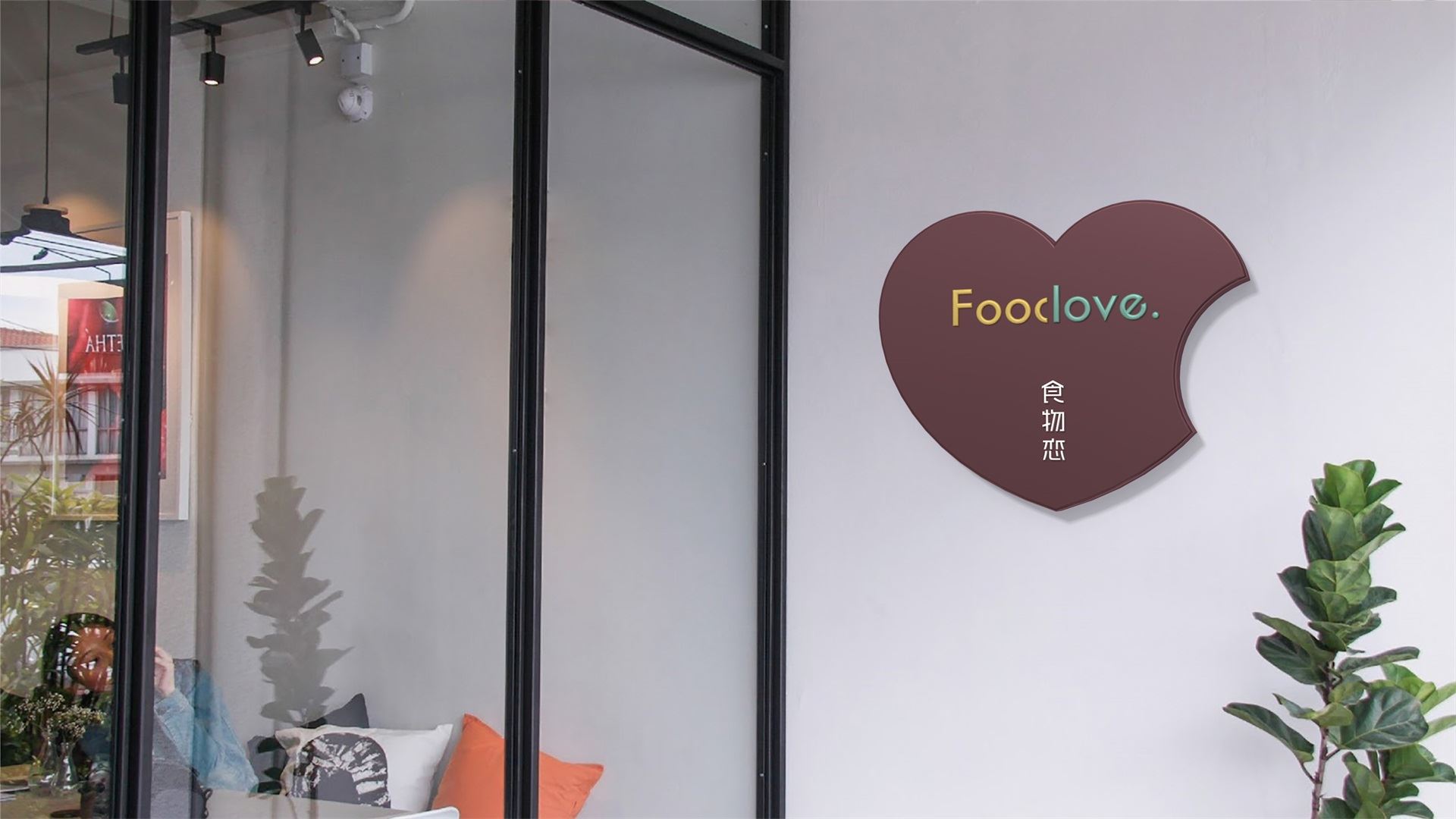為了塑造品牌的時尚品味、簡約現代的調性,我們選取了無襯線體。Food&love,在視覺表現上共用一筆,且使用兩種顏色,初看為兩個個體,但細看又不可分割,創意表現易與情感形成共鳴,明明是獨立的個體,卻難分難舍的依戀,有一種戀戀不舍的情意。此love情意滿滿,既是香氣四溢的食物之戀,亦是深情濃意的情感之約。
