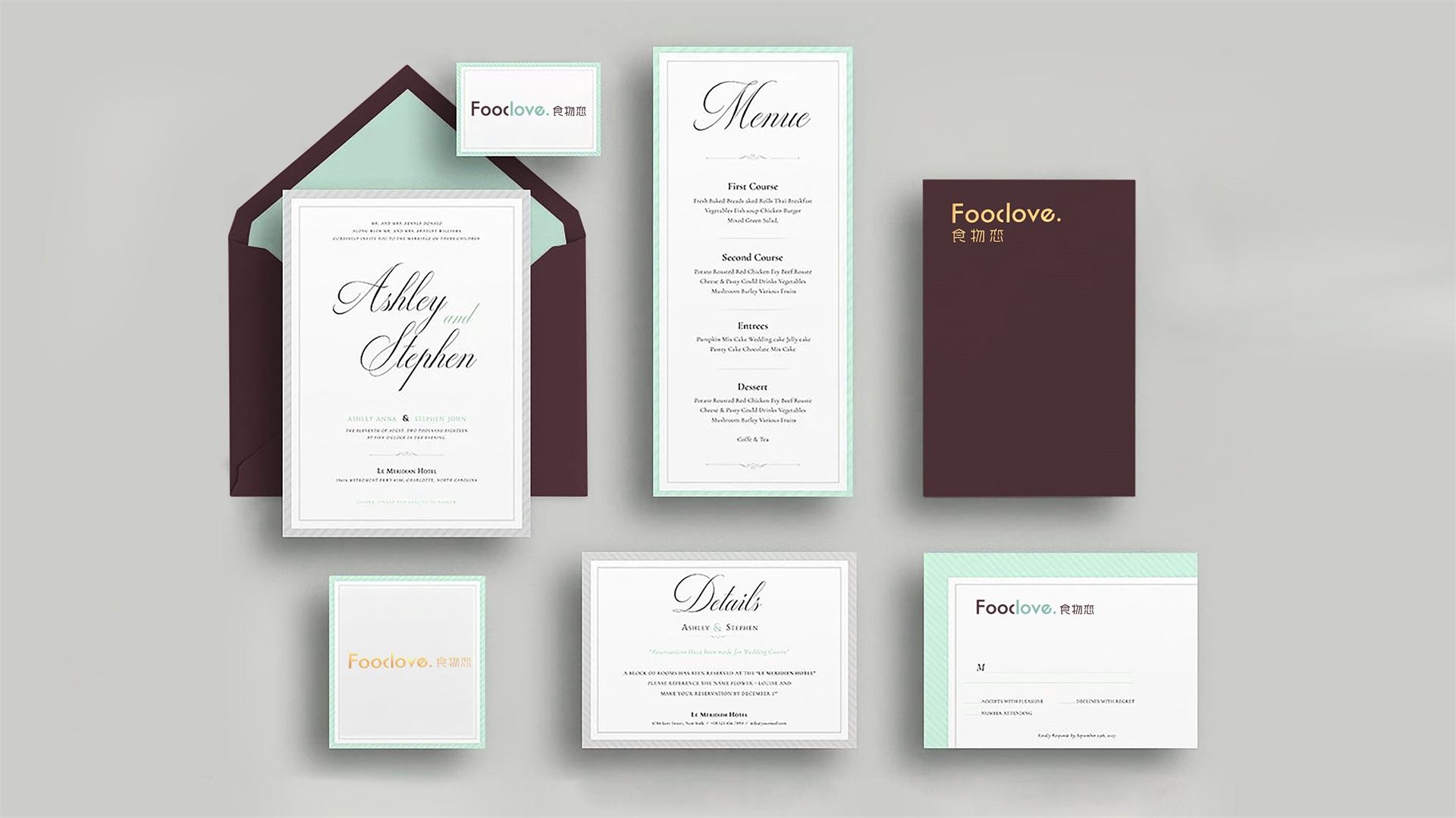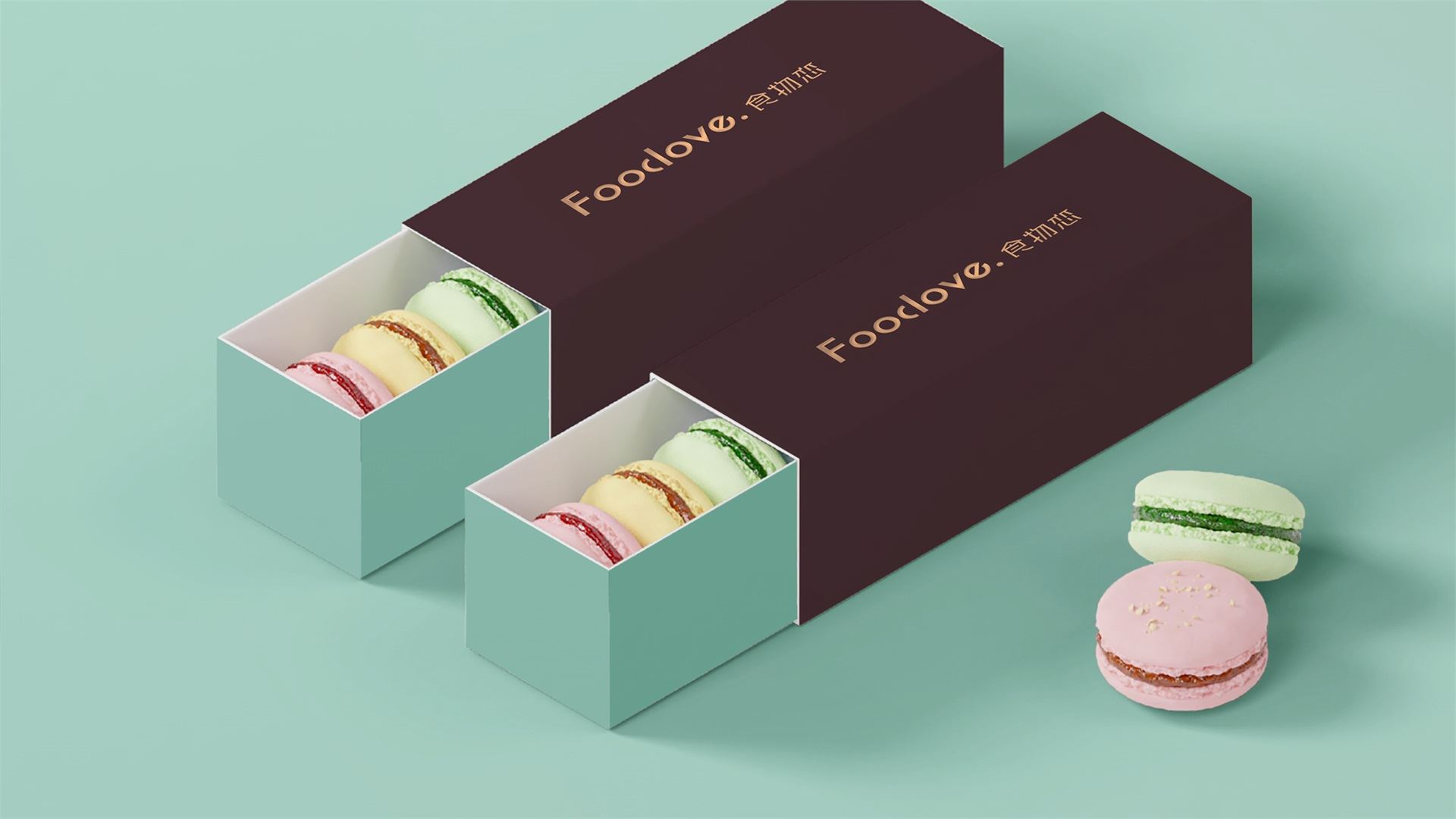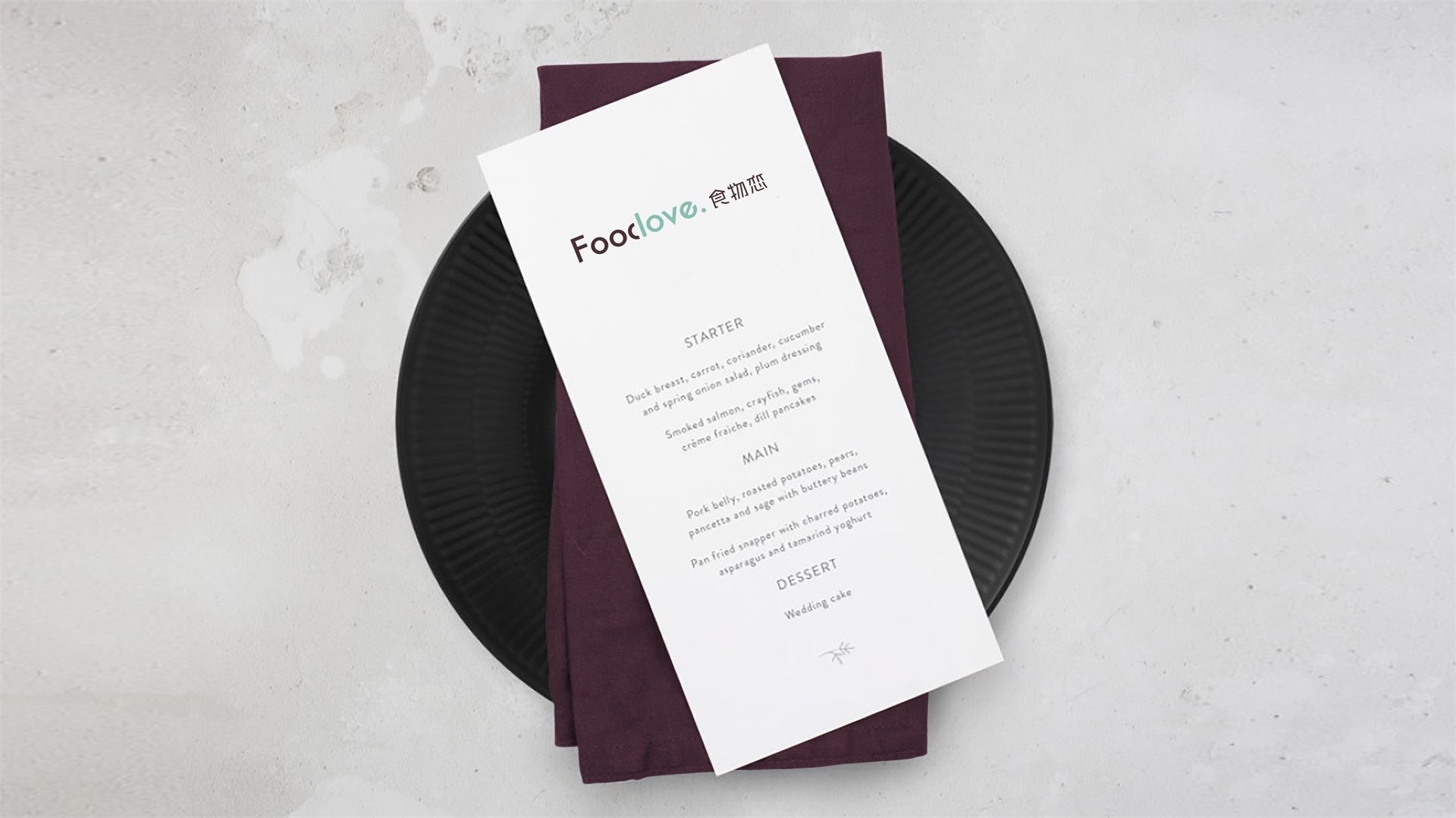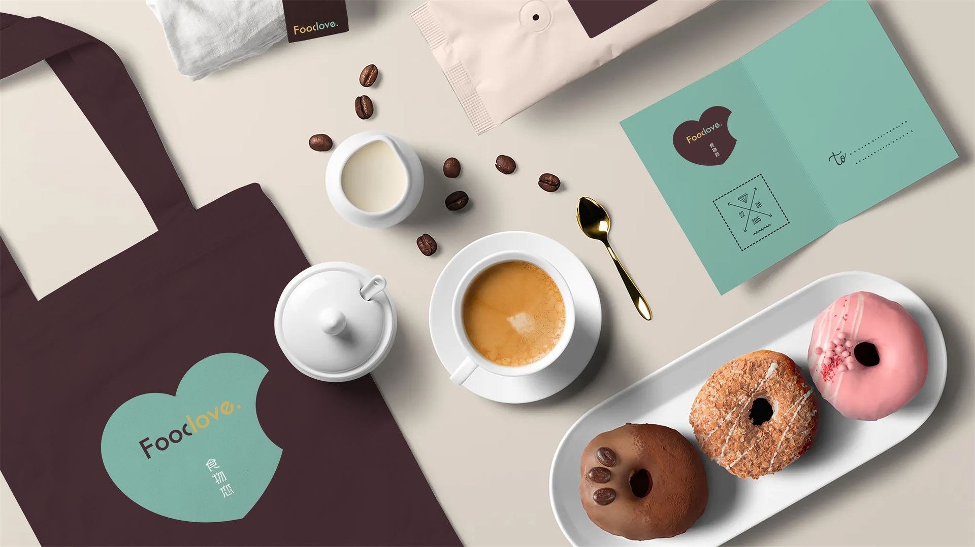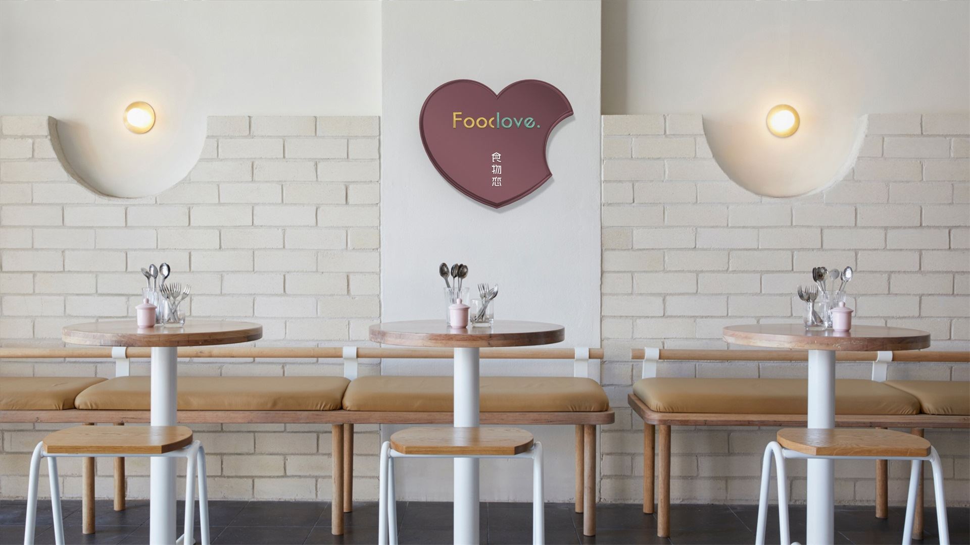 為了塑造品牌的時尚品味、簡約現代的調性,我們選取了無襯線體。Food&love,在視覺表現上共用一筆,且使用兩種顏色,初看為兩個個體,但細看又不可分割,創意表現易與情感形成共鳴,明明是獨立的個體,卻難分難舍的依戀,有一種戀戀不舍的情意。此love情意滿滿,既是香氣四溢的食物之戀,亦是深情濃意的情感之約。