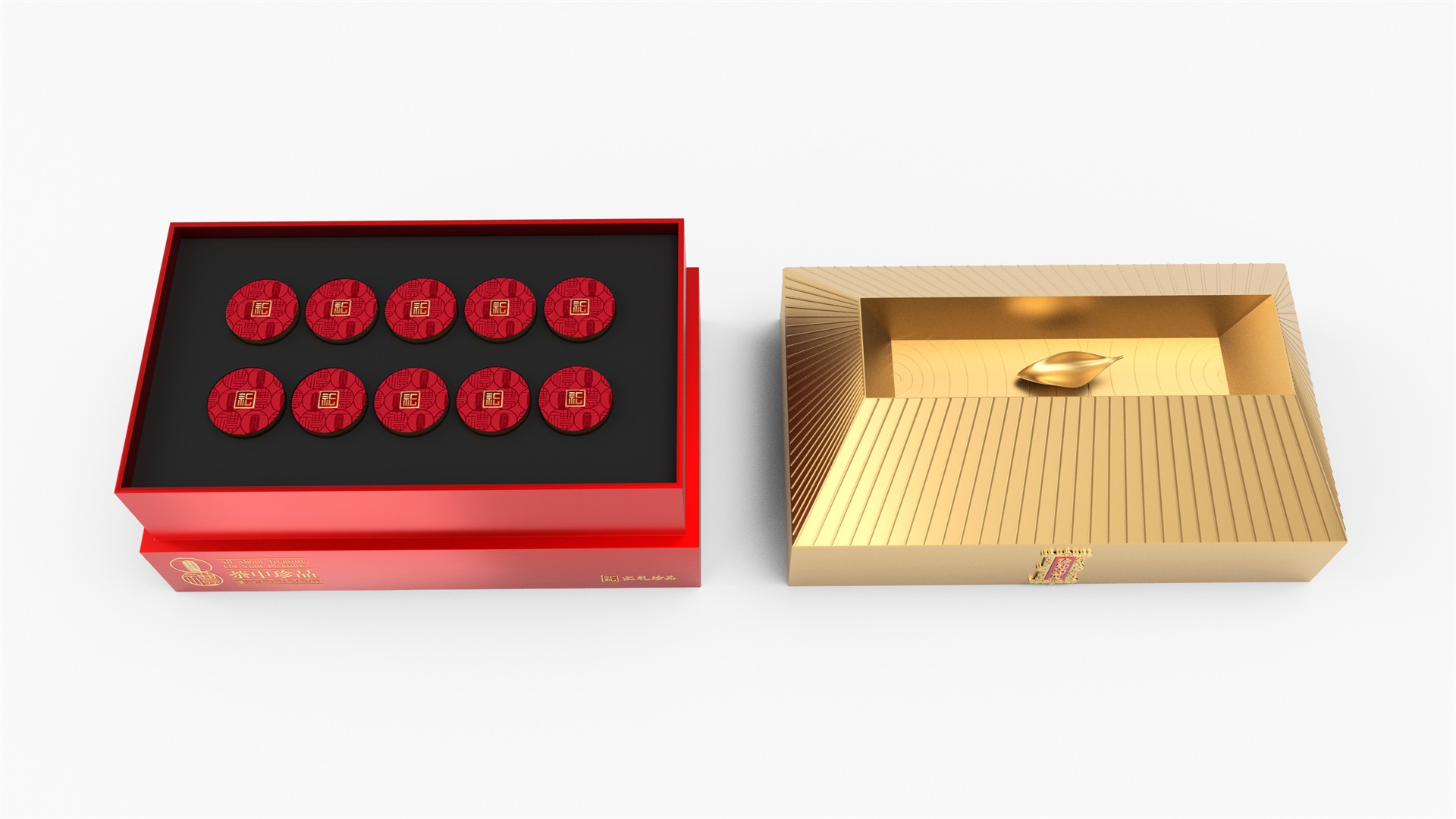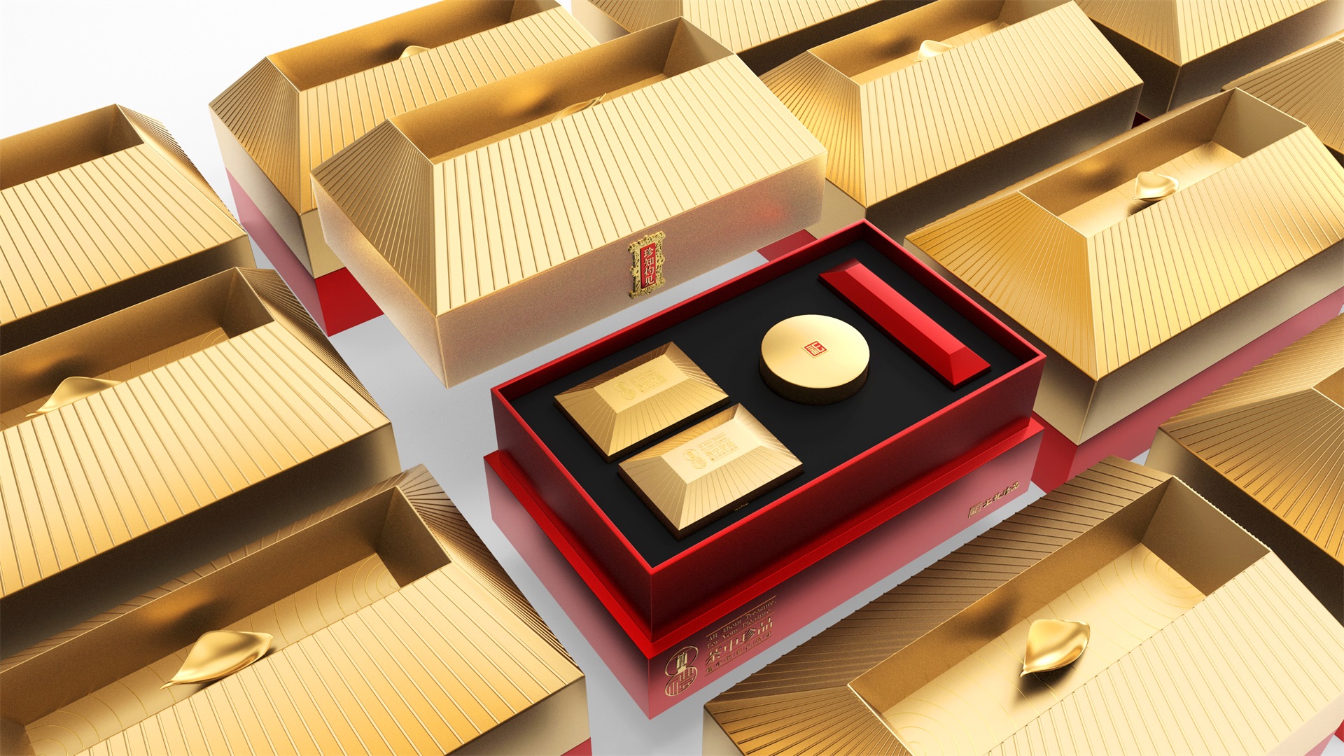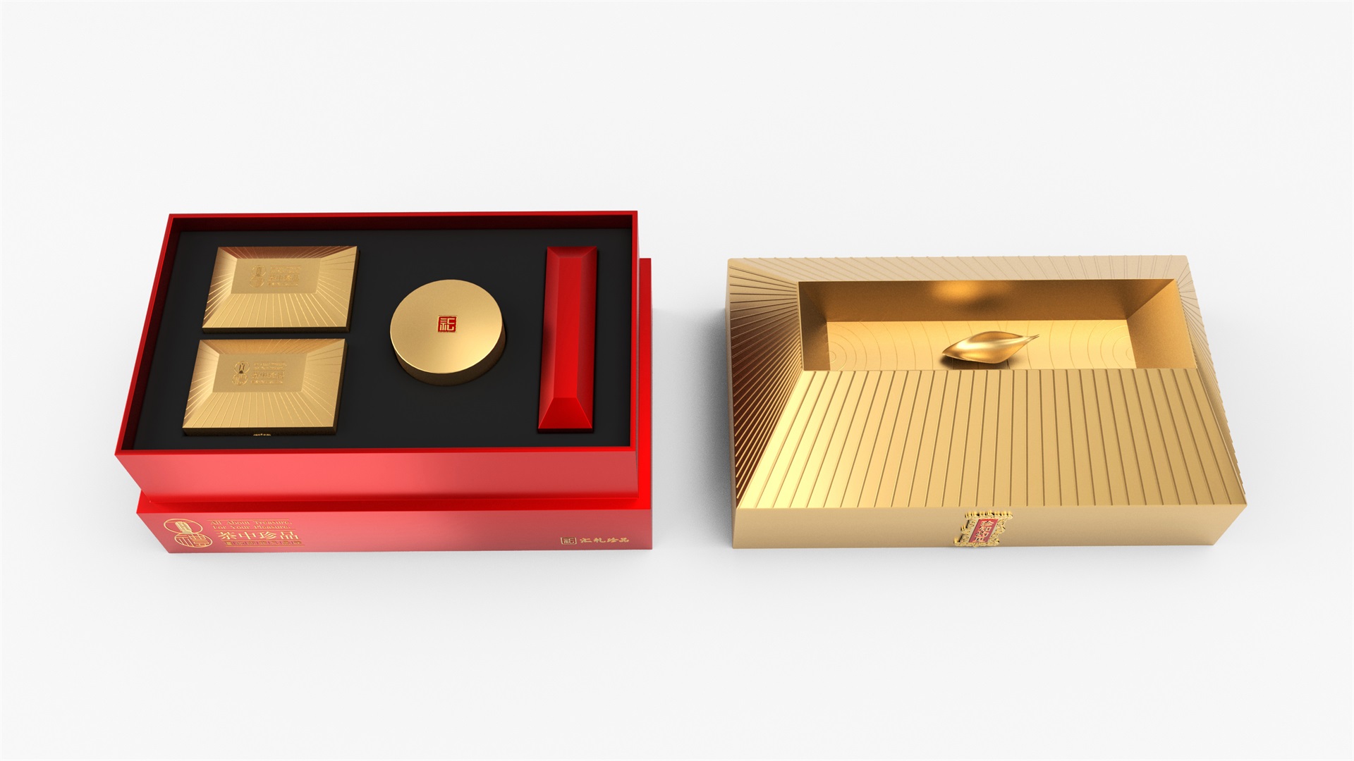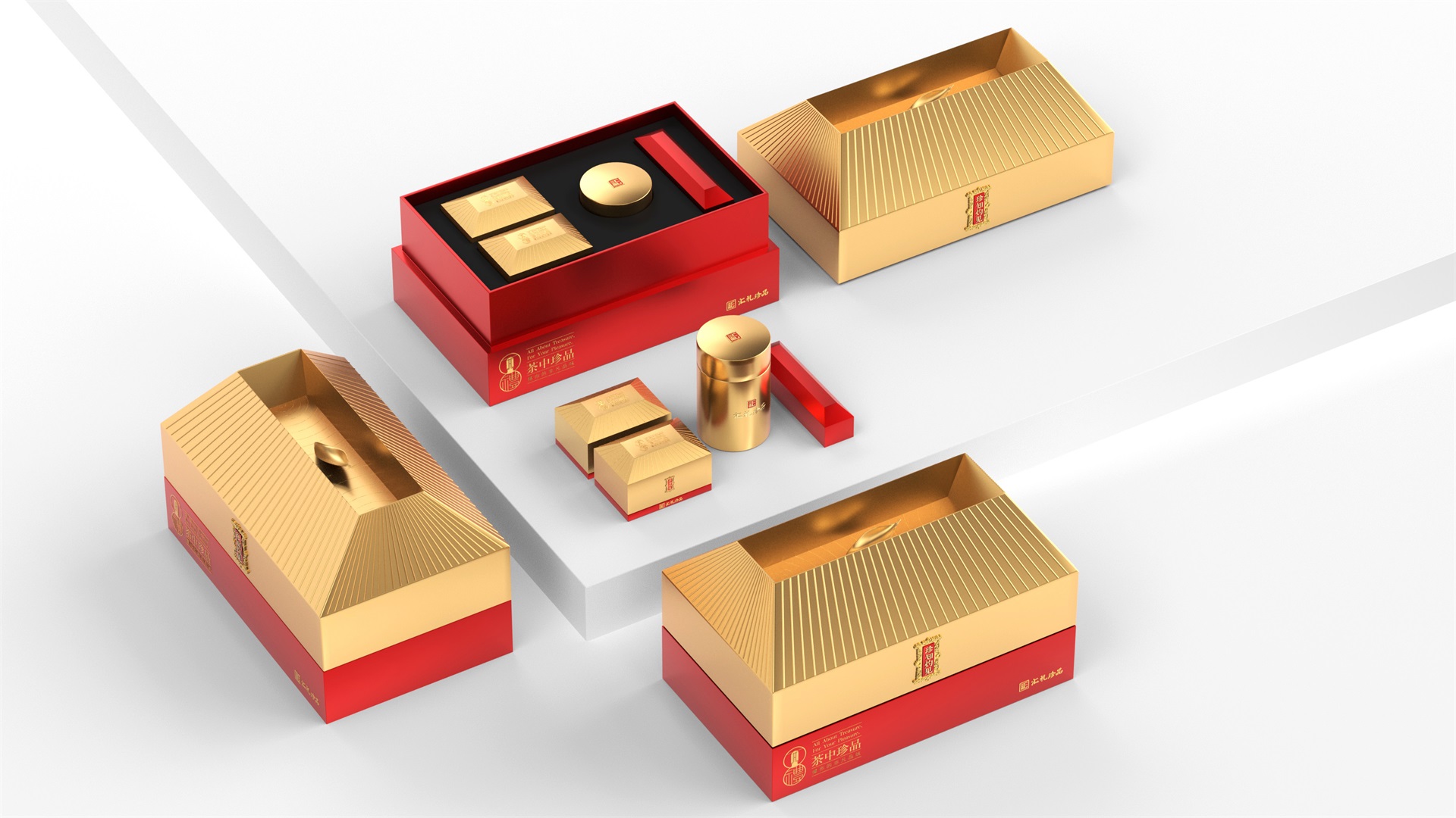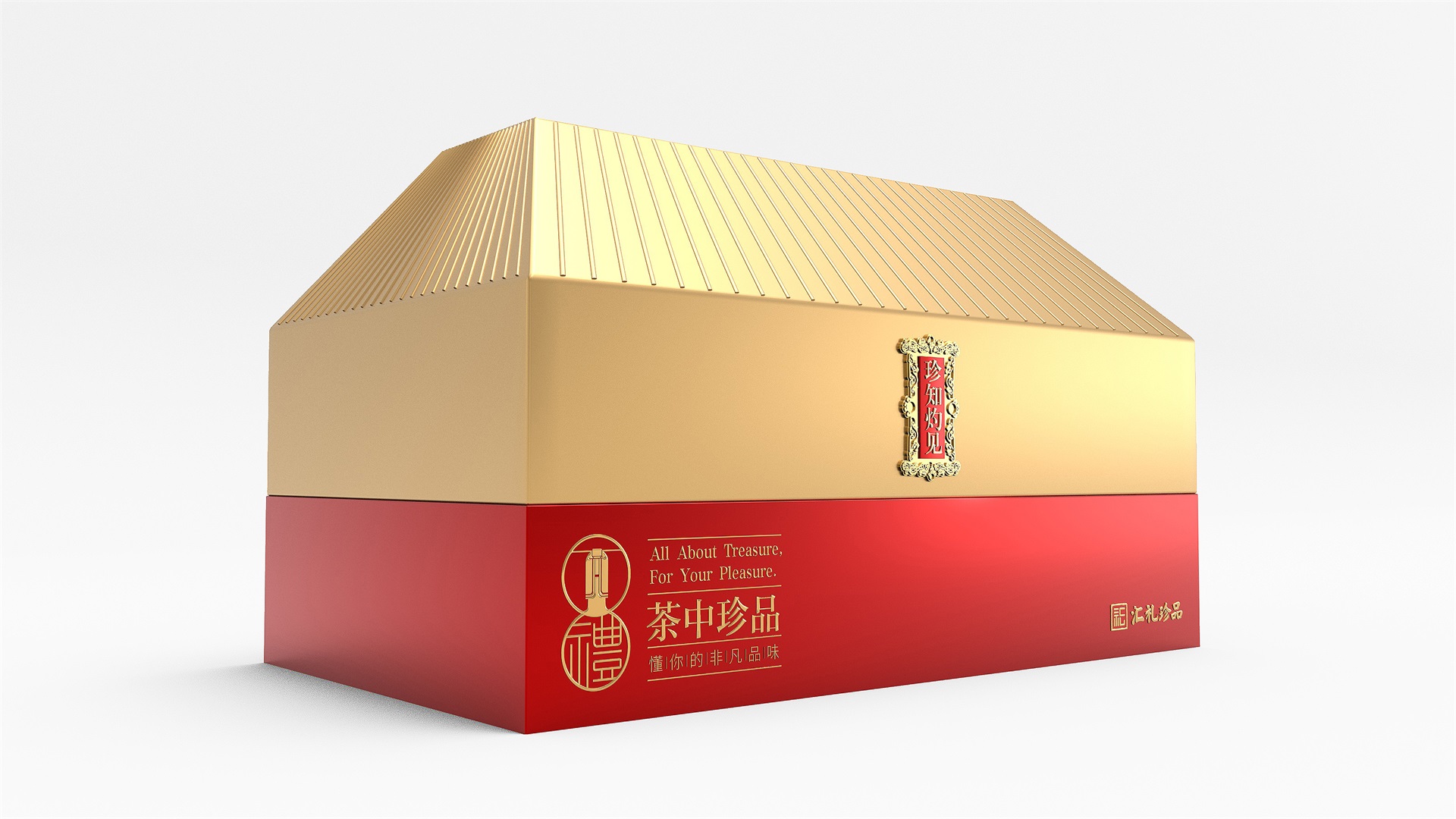 匯禮珍品包裝設計,基于產品品級為茶中王者級別,所以包裝整體造型采用中國古代地位的皇家元素:宮殿為設計靈感進行設計,包裝上蓋為金色宮殿屋檐造型,斜面上也裝飾了代表瓦片的條紋,上蓋中部內陷,底部使用水紋鋪底,在水紋上飄著一片金色的茶葉,高山流水覓知音,在一個上蓋營造出了基于高端氣質上,茶道與人道相融的意境畫面;在上蓋的正面中部,使用宮殿匾額形式作為展示包裝的品類名稱,將包裝的宮殿造型進一步完善。支撐金色宮殿下方的紅色地臺作為包裝下部,在正面放置文字信息和品牌標志。整體采用天地蓋的形式,使開蓋具備儀式感。內部分包裝與外部形式大體相同,但有所以簡略,保證整體性的同時也保證整體包裝不會過于繁復,保持平衡。