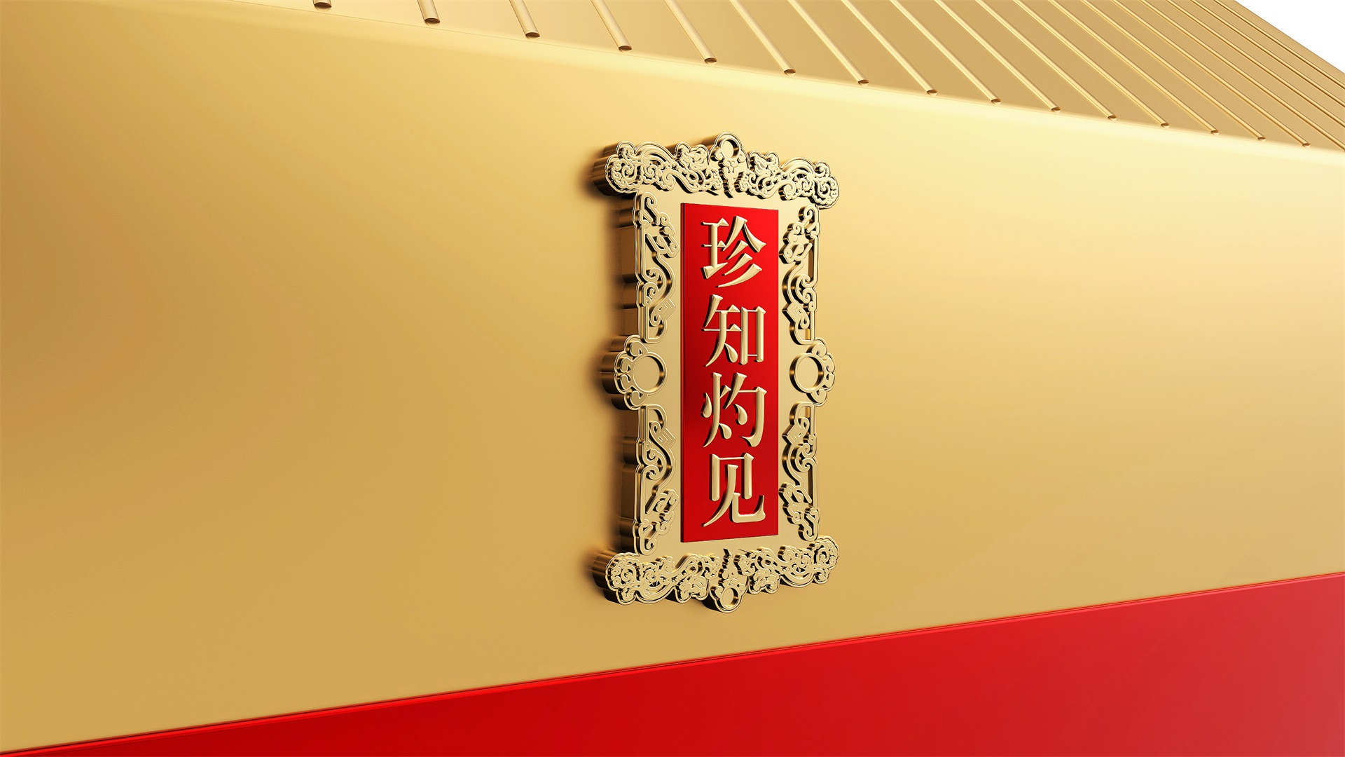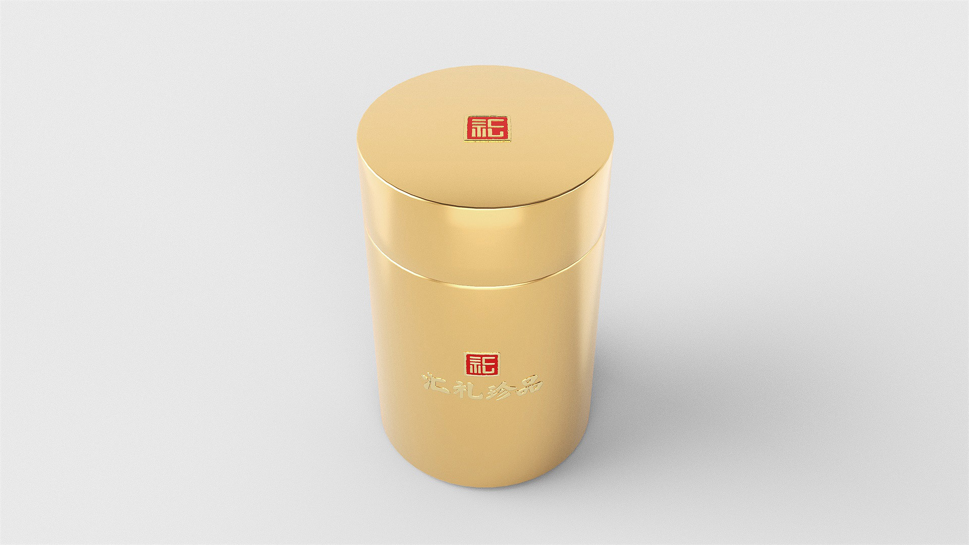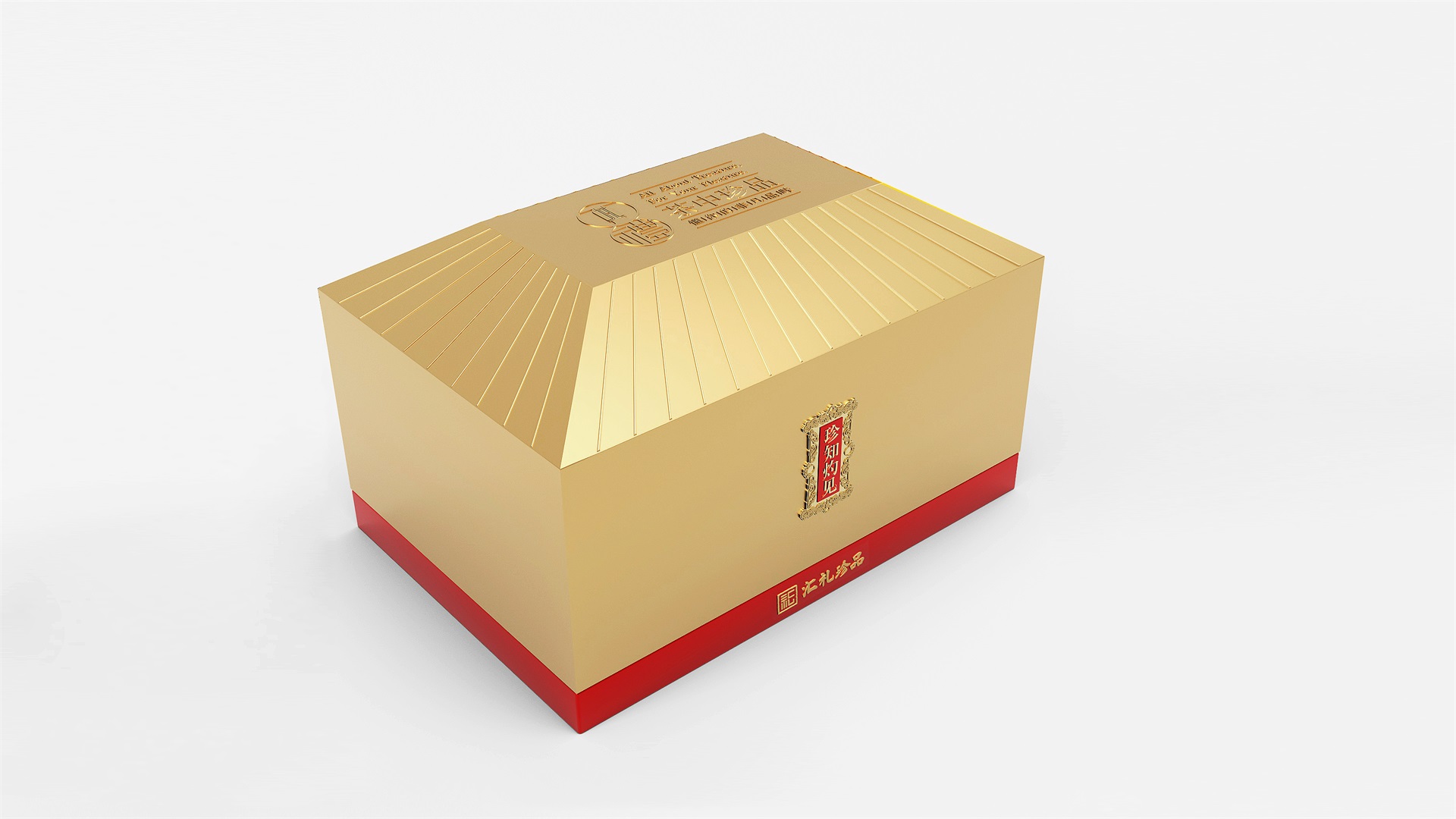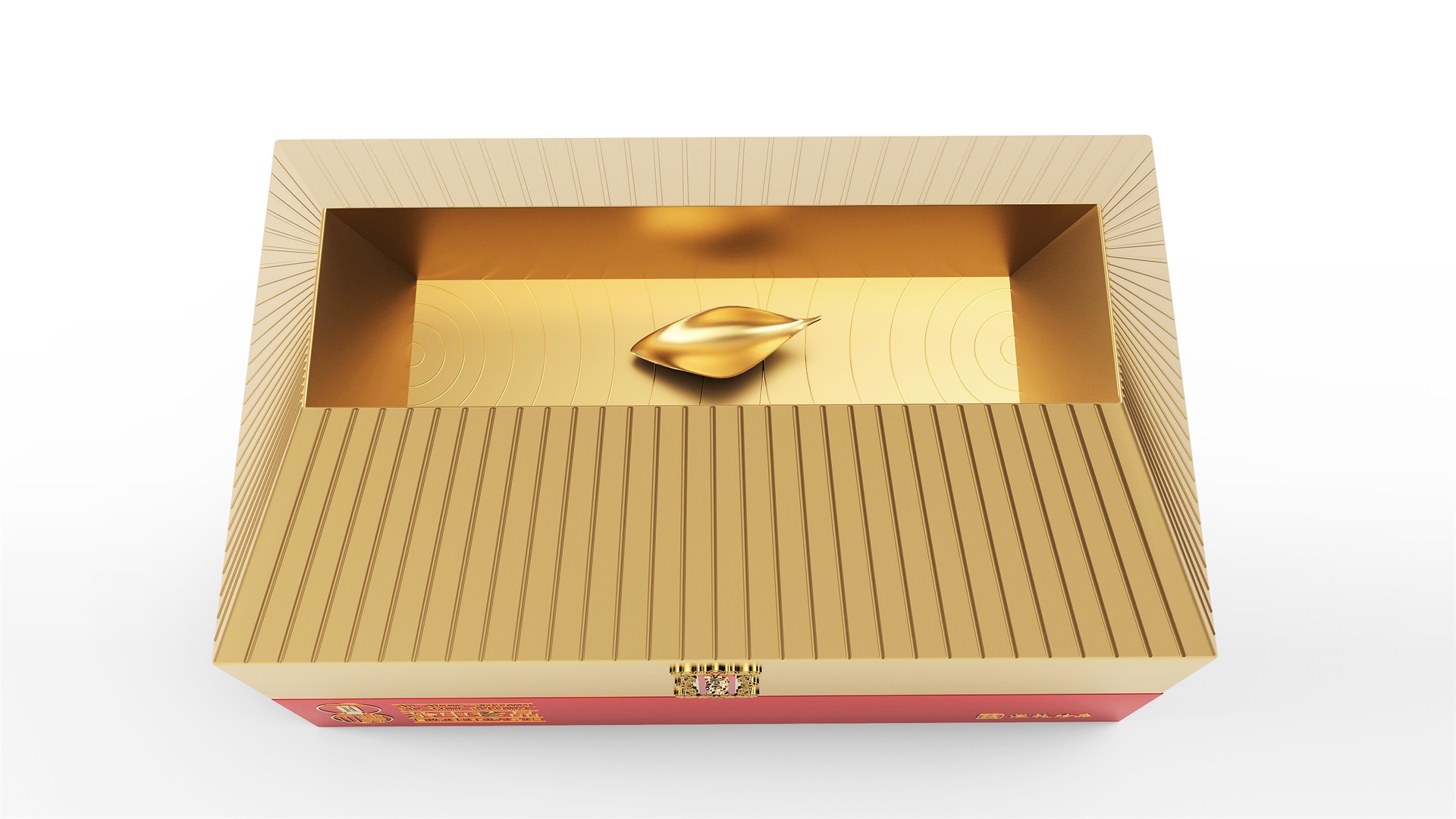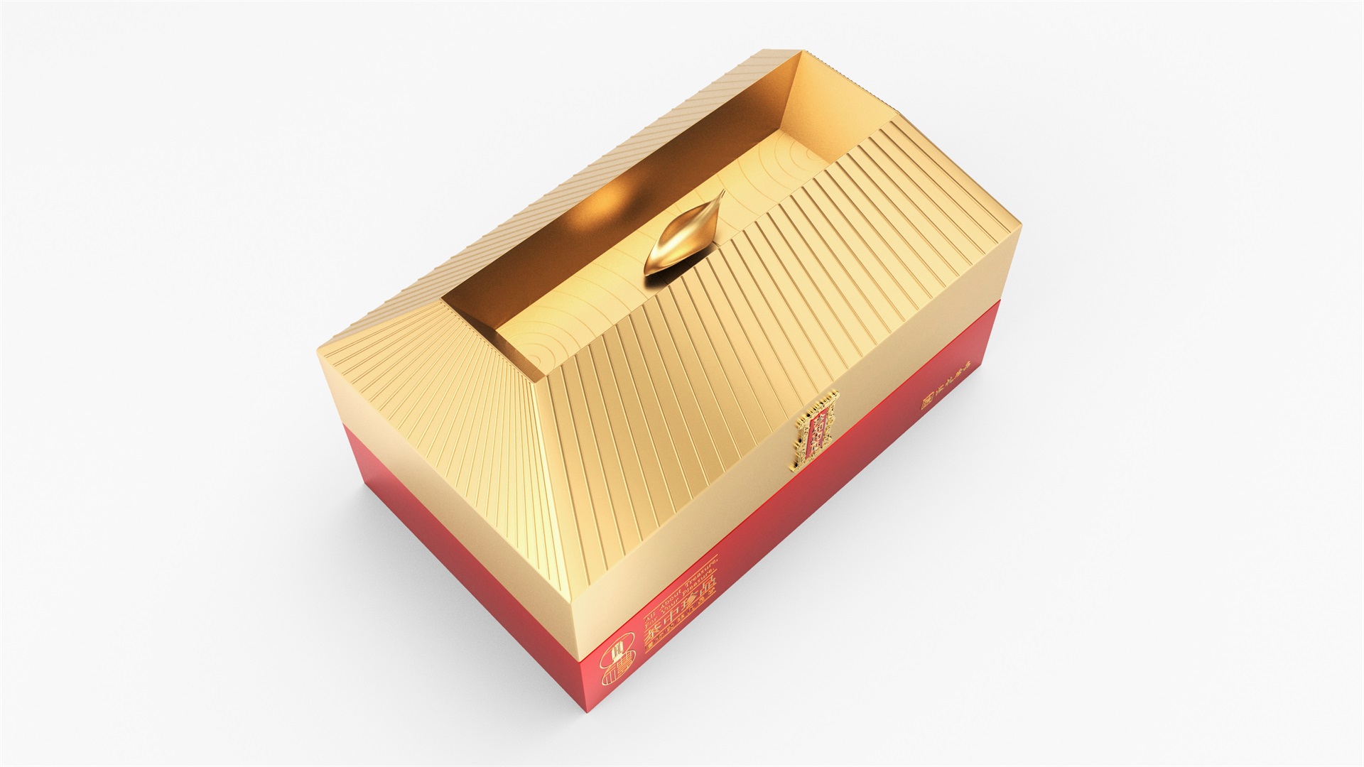 匯禮珍品包裝設計,基于產品品級為茶中王者級別,所以包裝整體造型采用中國古代地位的皇家元素:宮殿為設計靈感進行設計,包裝上蓋為金色宮殿屋檐造型,斜面上也裝飾了代表瓦片的條紋,上蓋中部內陷,底部使用水紋鋪底,在水紋上飄著一片金色的茶葉,高山流水覓知音,在一個上蓋營造出了基于高端氣質上,茶道與人道相融的意境畫面;在上蓋的正面中部,使用宮殿匾額形式作為展示包裝的品類名稱,將包裝的宮殿造型進一步完善。支撐金色宮殿下方的紅色地臺作為包裝下部,在正面放置文字信息和品牌標志。整體采用天地蓋的形式,使開蓋具備儀式感。內部分包裝與外部形式大體相同,但有所以簡略,保證整體性的同時也保證整體包裝不會過于繁復,保持平衡。